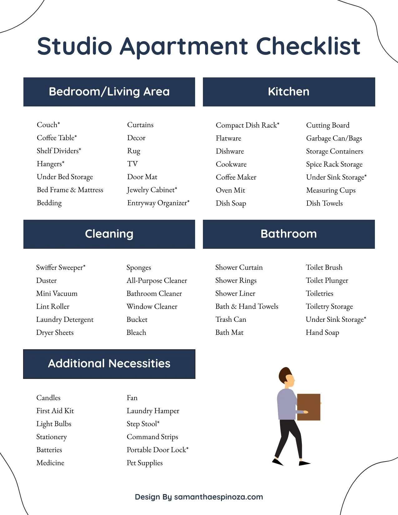 Download and print this studio apartment checklist or use the interactive file! Click the items with an asterisk mark for a product example perfect for a studio apartment. Feel the accomplishment every time you tick off a category!